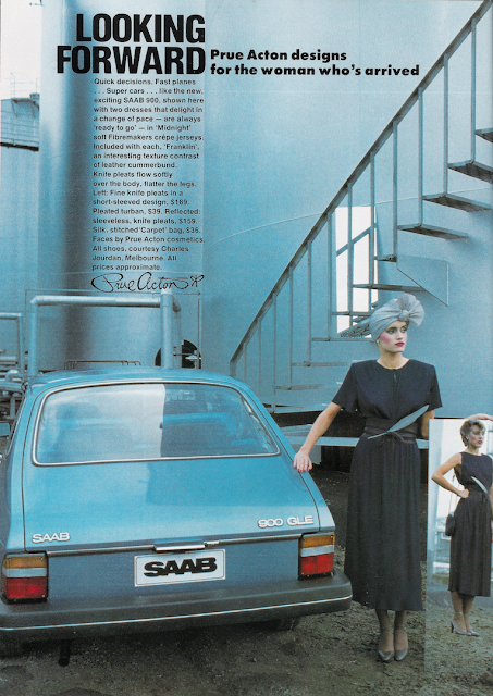 I recently acquired a bunch of Vogue magazines, so thought I'd add a post here from one of the issues. I simply adore a futurist themed shoot back when it was thought the future would be cool (it's more boring now than back then I think!). This Prue Acton for SAAB shoot reminds me a lot of one of the pictures from this Sheila magazine issue from 1980. It's funny how dated the car looks next to the 'futuristic' wares.